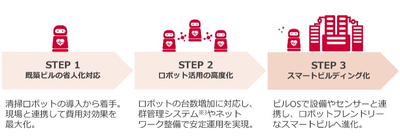 その後、ロボットの台数や用途の拡大に合わせて、ネットワーク環境の整備やICTセンサー、AIの導入を段階的に進めることで、ロボット導入効果の最大化およびロボットフレンドリーなスマートビルの実現に寄与します。